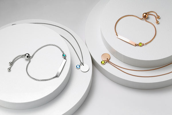 The bracelet comes in silver and rose gold with a selection of 12 birthstone charms to choose from. You can personalise the bar of the bracelet with names, initials, dates or a message of your choice and pick from a selection of three engraving styles to match your taste.